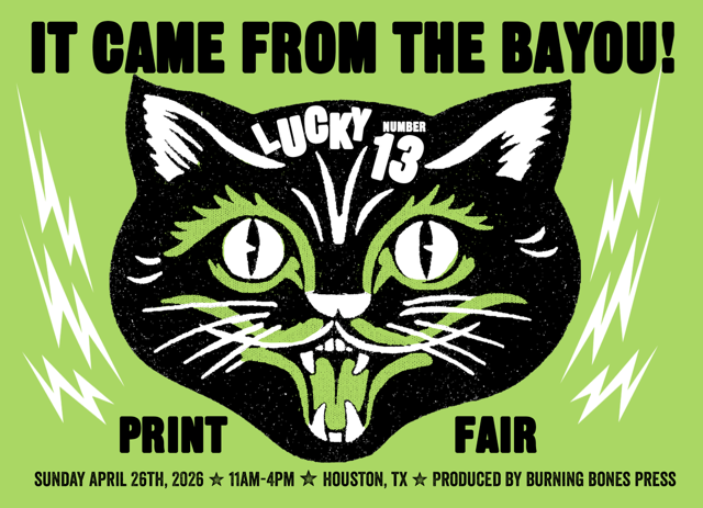 Printmakers from across the country descend upon Houston during Burning Bones Press’ Annual “It Came From The Bayou!,” printmaker print sale, every April at Saint Arnold Brewing Co. It Came From The Bayou! showcases work for sale by sought-after printmakers from across the U.S. This event is free and open to the public.